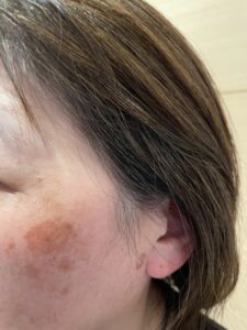 また、1ヶ月後くらいに炎症後色素沈着(=戻りジミ)ができることがありますので、遮光や保湿、摩擦を避ける、などの施術後ケアが大切になります。炎症後色素沈着は、半年〜1年くらいかけて徐々に薄くなっていきます。